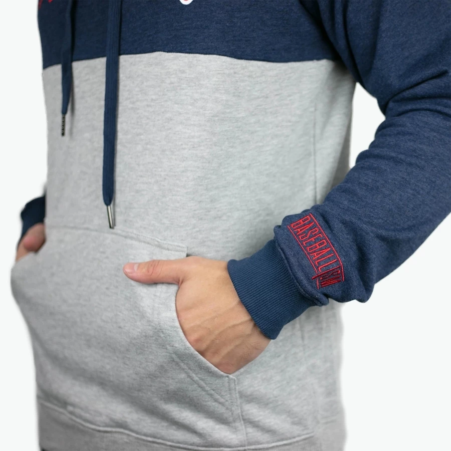 America and its pastime are represented with pride on this color blocked hoodie featuring the Flag Man and Baseballism’s iconic Home Team logo.